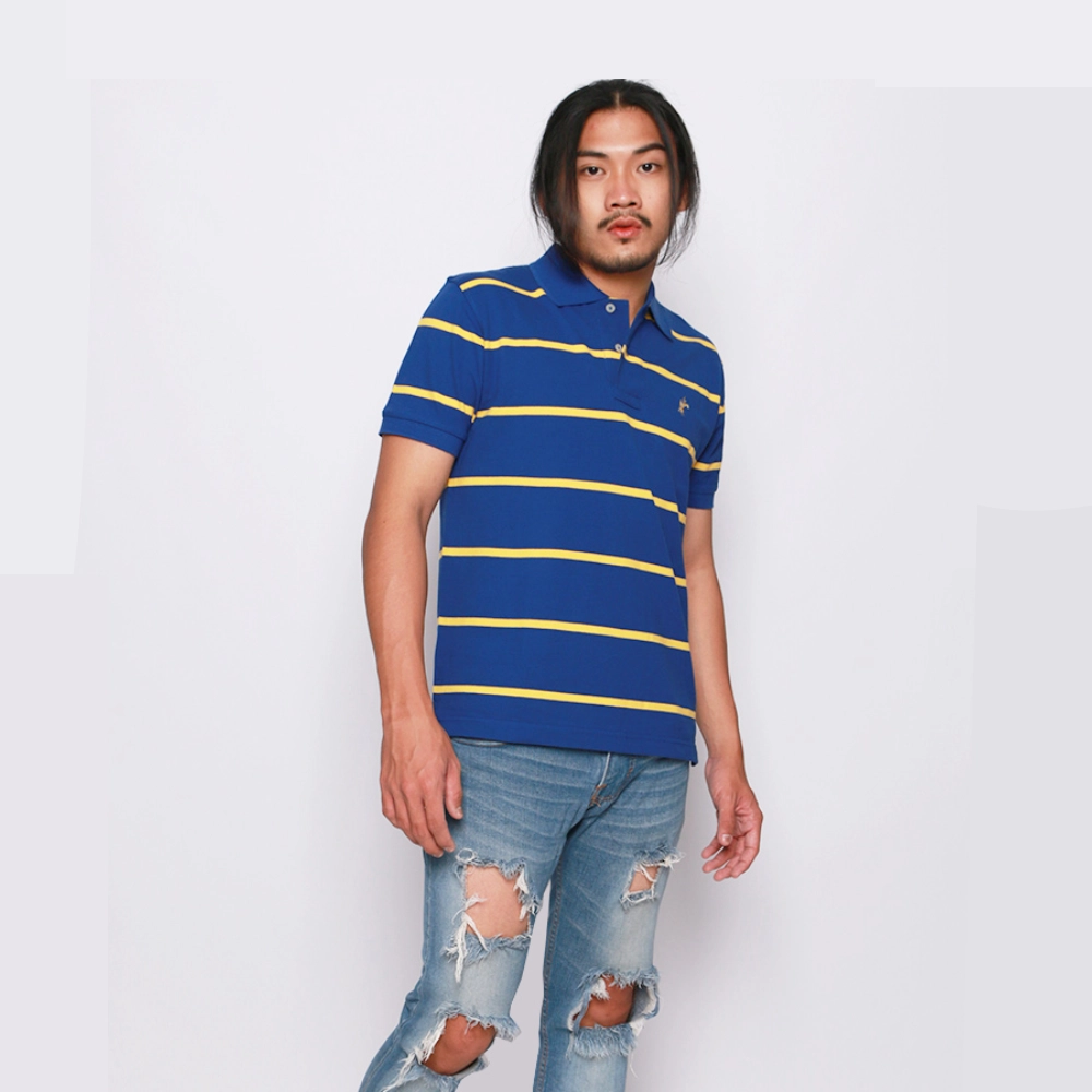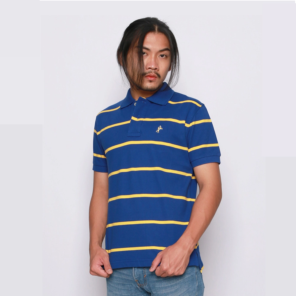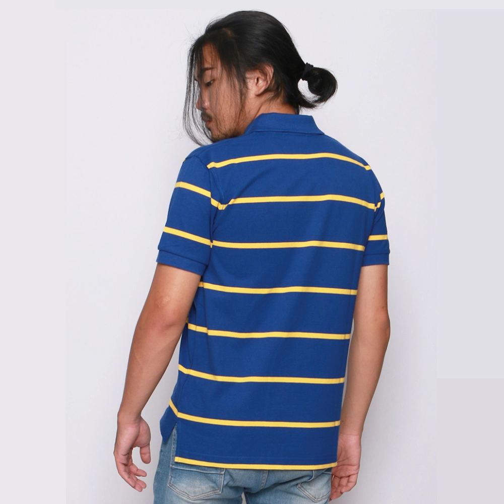Polo shirt paduan Royal Biru – Kuning cerah dan dinamis dengan kombinasi royal biru 5,2 cm dan kuning 1 cm stripe yang menonjolkan dominan dan berjiwa muda.